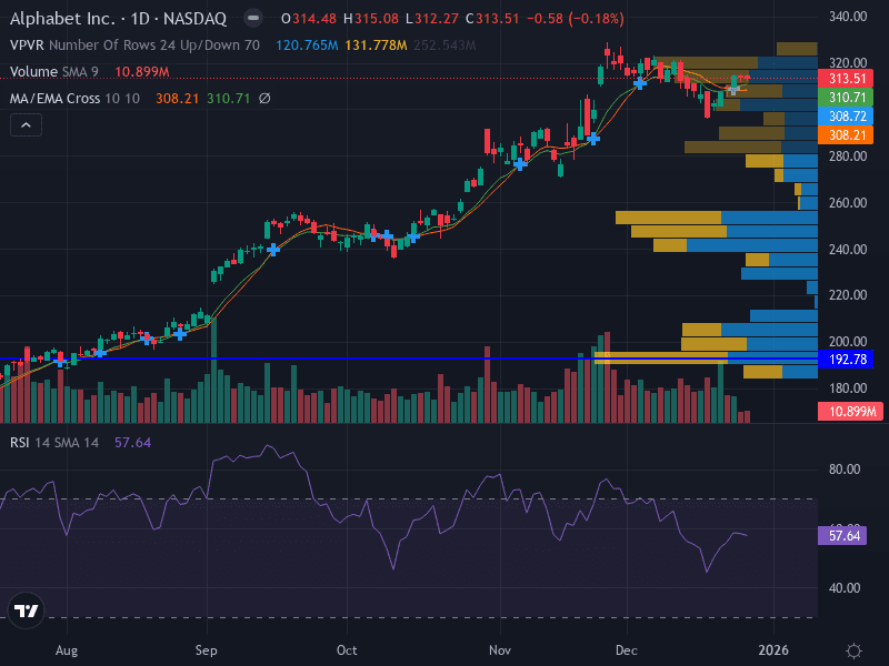 Trend: GOOGL remains in a strong uptrend, trading above its 10-day EMA and consolidating near recent highs. The daily chart shows a series of higher highs and higher lows since August 2025.