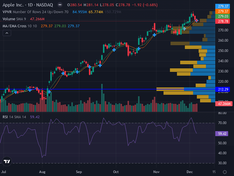 Stock Price Fluctuations: AAPL traded between $278.78 and $286.19 over the last week, with the most recent close at $278.78 (Dec 5, 2025). [Source]