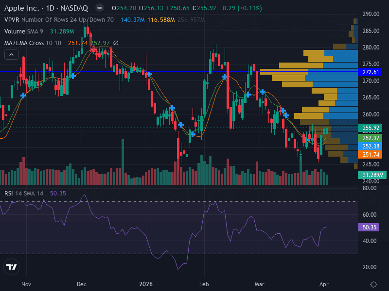 Price Action: Bearish candle on March 30, sharp rebound March 31. Trading range established between $245.91 and $255.49.