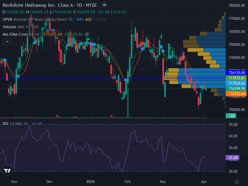 With a persistent downtrend, bearish technicals, and a lack of fresh news, BRK.A is likely to remain under pressure in the first week of April 2026. Traders should watch the $710,700 support and $724,125 resistance for directional cues. A breakdown below support could open the door to further declines, while a reversal above resistance would be needed to shift sentiment. Stay nimble and manage risk appropriately.