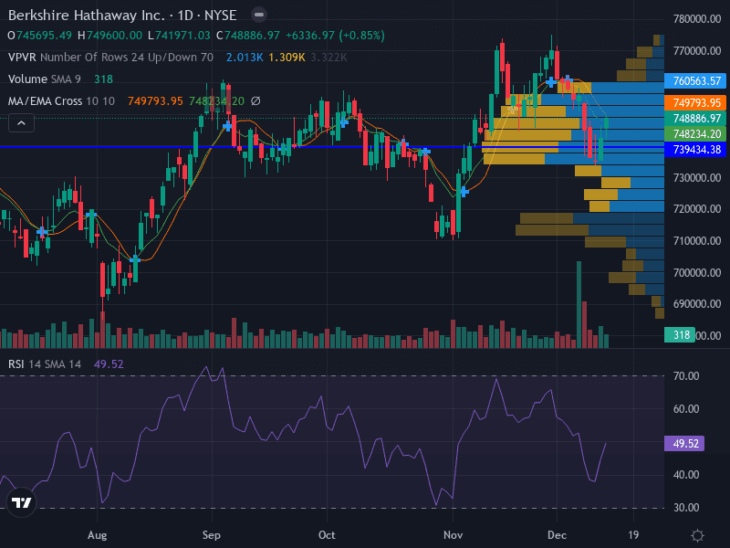 Consolidation: BRK.A is consolidating between 739,434 and 760,563, with price action closely hugging major moving averages.