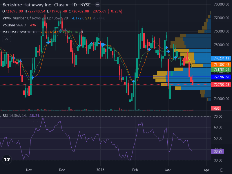 Stock closed at $720,702 on March 20, 2026, down 0.29% from the prior day, continuing a short-term downtrend. [Source]