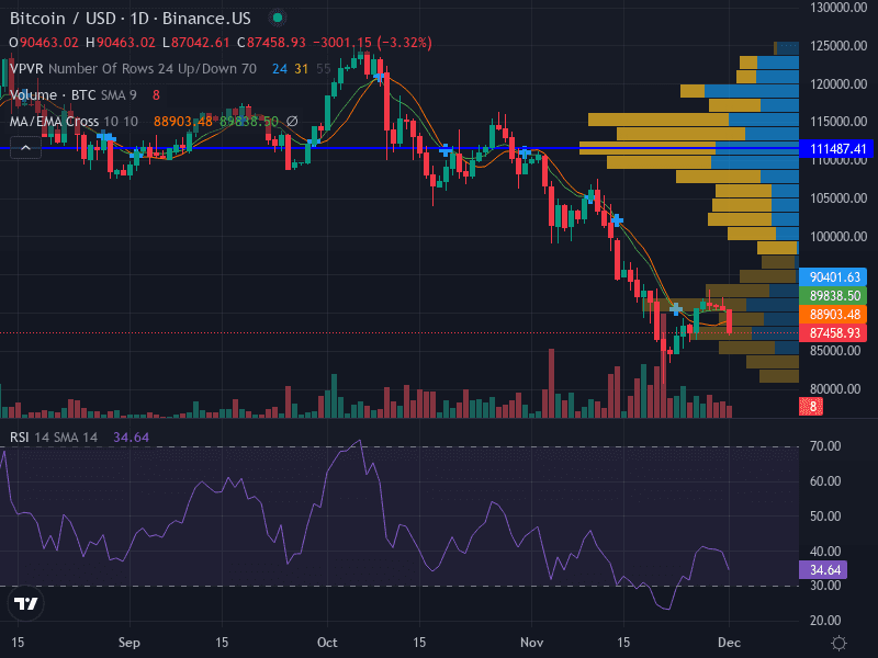 Bearish momentum dominates Bitcoin’s technical landscape this week. The price is trading below key moving averages, with a falling RSI and a possible descending triangle pattern. Recent news highlights macroeconomic uncertainty, especially around the Federal Reserve’s December meeting, and seasonal factors that could influence volatility. Let’s break down the details.