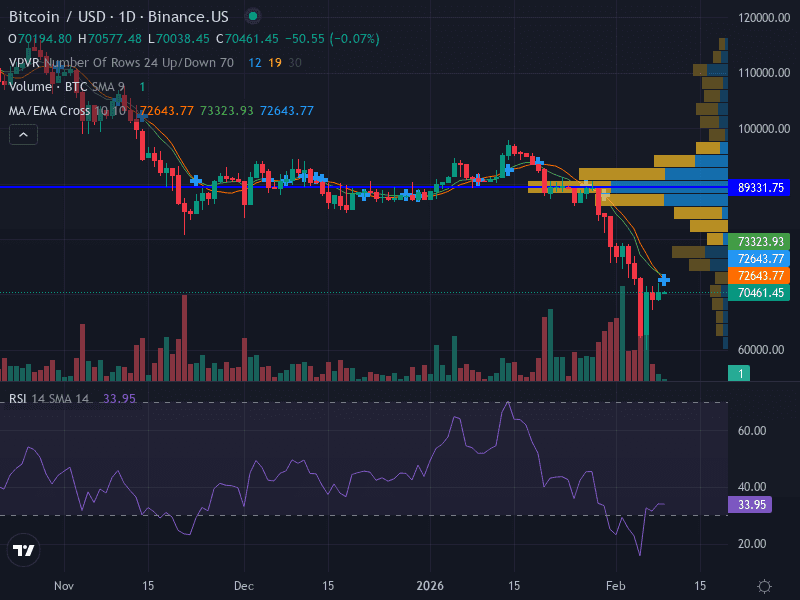 Support & Resistance: Major support at $70,000, minor at $73,000. Resistance at $75,000 (minor) and $89,000 (major).