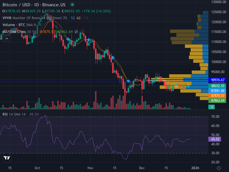 Neutral/Range 🟡 | Consolidation between 87,875 and 90,976 | Range-bound | Scalp small moves; avoid large positions | Use ATR(14) for dynamic stops |