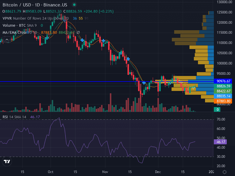 Pattern | Range-bound/Rectangle formation – BTC is oscillating between $87,883.80 and $90,976.67. |