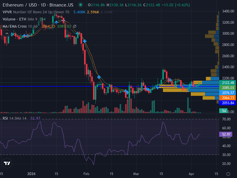 Chart Structure: ETHUSD is trading sideways, oscillating between 2064.73 and 2128.42. No clear breakout attempts are visible.