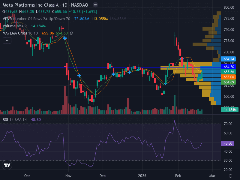 Stock Performance: META closed at $655.66 on Friday, February 20, 2026, up 1.69% from the prior day and 0.98% above its opening price. [Source]