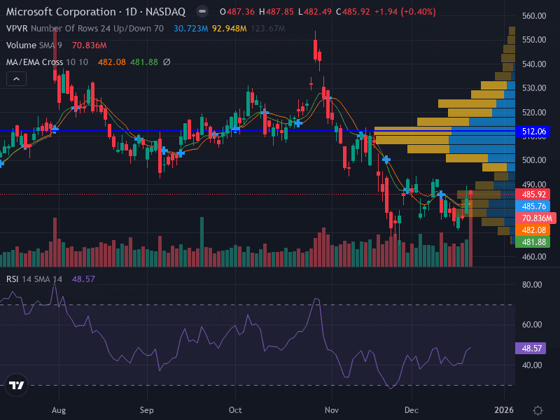 Microsoft (MSFT) enters the final week of December 2025 in a consolidation phase, with strong fundamentals and bullish analyst sentiment providing a supportive backdrop. However, the technical picture suggests patience is warranted as the stock trades within a well-defined range. Traders should watch for a decisive move above $495 or below $470 for the next directional cue, while investors can take comfort in Microsoft’s continued growth and innovation leadership.