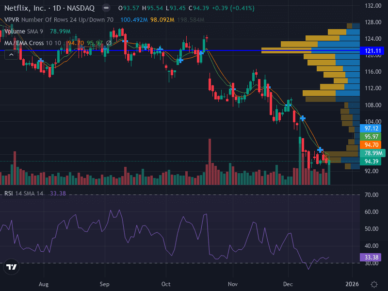 Netflix (NFLX) enters the final week of December 2025 under clear bearish pressure, with technicals and sentiment aligned for further downside unless a significant catalyst emerges. Traders should monitor the $92.00 and $97.00 levels closely and employ disciplined risk management. Any sustained move above $100.00 would warrant a reassessment of the bearish bias.