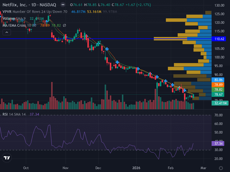 Bearish momentum: NFLX is trading below key moving averages, with a strong downtrend dominating since November 2025.