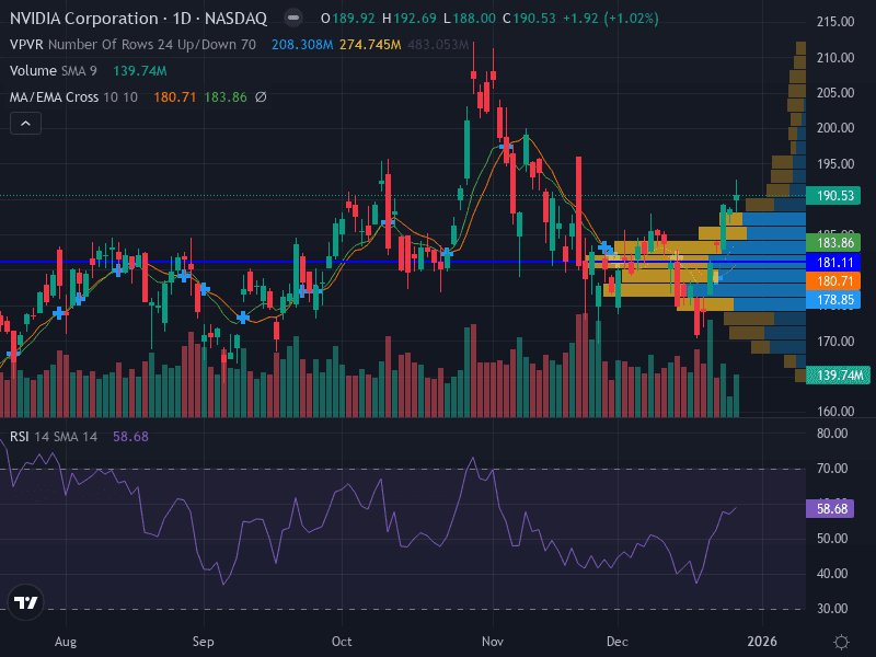 NVIDIA enters the first week of January 2026 with strong bullish momentum, underpinned by record financial results, robust demand for AI hardware, and strategic expansion into inference technology. The technical setup favors further upside, but traders should watch for potential overbought signals and respect key support levels. The week’s actionable scenarios provide clear entries and exits for both bullish and bearish outcomes. 🚦