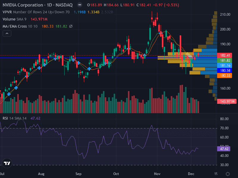 Dec 6, 2025 | NVDA traded between $180.91 and $184.93, closing near $182.35. Market cap at $4.49T, P/E 45.18, yield 0.02%. | Neutral – Reflects ongoing consolidation and lack of decisive direction. | |