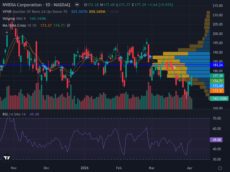 Comprehensive weekly analysis of NVIDIA (NVDA) for Week 1 April 2026: technical chart review, latest news, support/resistance, MACD, volume, and actionable scenarios for traders and investors.